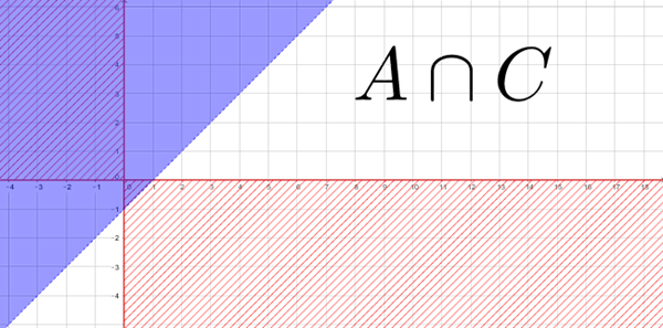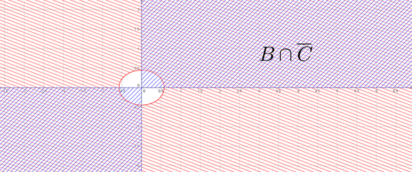 Dibujar en gráficas separadas los conjuntos A∩C y B∩C^c, donde C^c es el complemento del conjunto C con respecto a R^2.