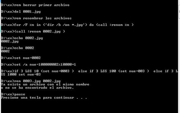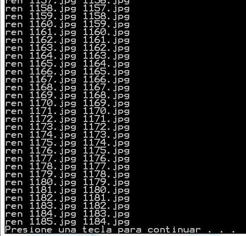 @echo off rem borrar primer archivo del 0001.jpg rem renombrar los archivos for /f %%n in ('dir /b /on *.jpg') do (call :renom %%n) goto :eof :renom echo %1 echo %~n1 set nue=%~n1 set /a nue=10000%nue%%%10000+1 if %nue% lss 10 (set nue=000%nue% )else if %nue% lss 100 (set nue=00%nue% )else if %nue% lss 1000 set nue=0%nue% ren %nue%.jpg %1 goto :eof