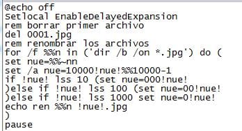 El segundo código solo me borra el 0001.jpg pero despues no me renombra los archivos.Te mando capturas de pantalla de lo que se ve visualmente al ejecutar el bat, y otra captura con el código con las rectificaciones que me comentas al final de tu mensaje, por si acaso me he equivocado o malinterpretado tus instrucciones