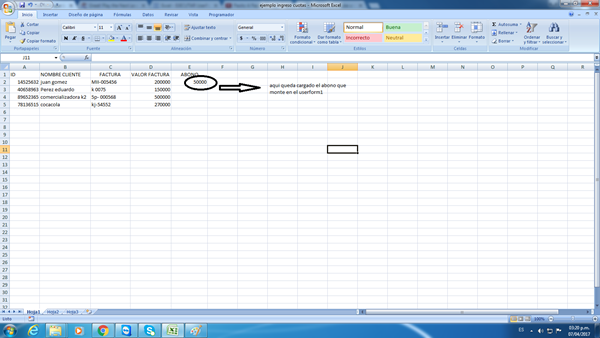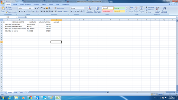 En la hoja 1 tengo unos datos de clientes, en las columnas: IDENTIFICACIÓN, NOMBRE, FACTURA, VALOR FACTURA, ABONO .. Esos son los datos que ocupan las 5 primeras columnas y las filas las ocupan los datos de los clientes .