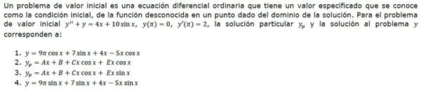Para el problema de valor inicial ?′′+?=4?+10sin?, ?(?)=0, ?′(?)=2, la solución particular ?