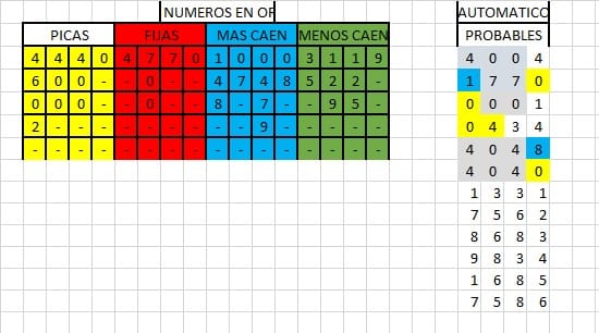 Bueno el problema es el siguiente tengo un listado de números llamados PROBABLES lo que necesito es que de acuerdo a las columnas de NÚMEROS EN ORDEN se marquen los números en su respectivo sitio del color en PROBABLES y aquellos números que tienen de a dos colores los deje en color gris como se puede observar, y además aquellos números de 4 cifras que tienen un color en sus cuatro cifras o no tienen ninguno sean eliminados como el 1331 hacia abajo