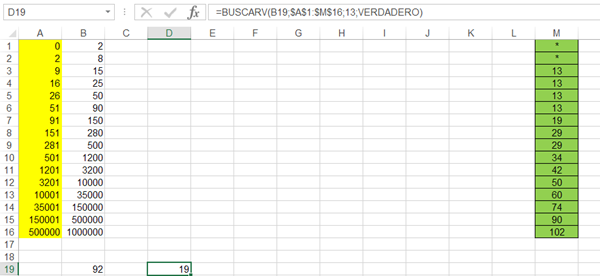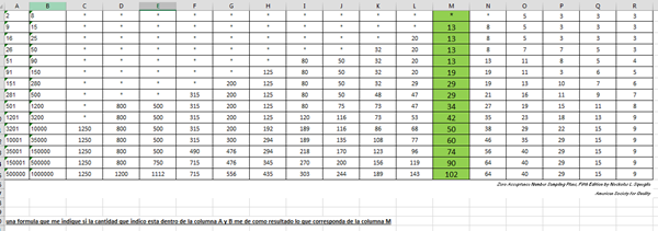 Tengo un problema con una fórmula que por más que intento no me sale bien, tengo una tabla con datos, pero necesito que al yo indicarle un valor que este entre la columna A:B y de el resultado que corresponda de la columna M. Yo se que esto se hace con index y match pero no me sale, me podrían ayudar.