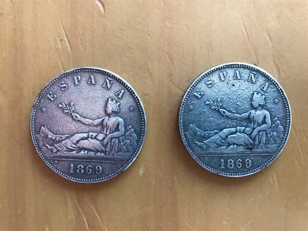 Tengo estas dos monedas de 1869, han estado en casa toda la vida, pero no se si pueden ser originales o una simple réplica. He estado investigando por internet pero no llego a ninguna conclusión, ¿me podéis ayudar? Muchas gracias.