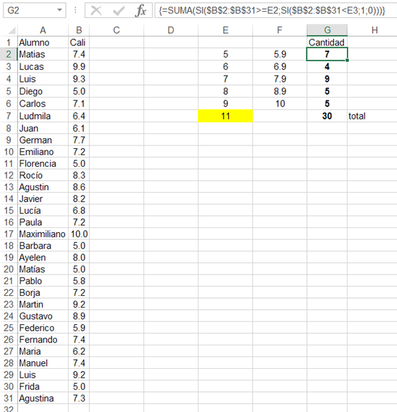 Hay una lista de alumnos y a la derecha construí una tabla donde están los segmentos de calificaciones a contar.