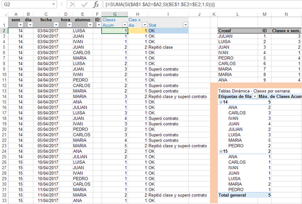 Adicionalmente, dejé un ejemplo de una tabla dinámica que hace un resumen por persona y por semana del MAXimo de clases tomadas.
