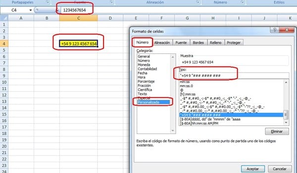 Quiero personalizar las celdas para que me muestren un numero de teléfono con característica internacional. La celda debería devolver el siguiente numero +54 9 xxx xxxx xxx