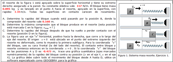 El resorte de la figura 1 está apoyado sobre la superficie horizontal y tiene su extremo derecho asegurado a la pared. Su constante elástica vale 117 N/m. El bloque tiene masa 0.895 kg y es lanzado en el punto A hacia el resorte, apoyado en la superficie, con rapidez . Todas las superficies en contacto carecen de rozamiento.