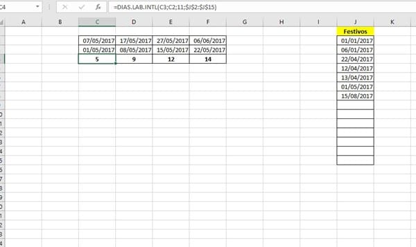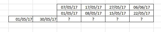 Tengo unas fechas de vacaciones, por ejemplo del 1/5/17 al 30/5/17 y necesito saber los días laborables que hay de ese periodo de vacaciones en cada semana de mayo (o cualquier otro rango de fechas)
