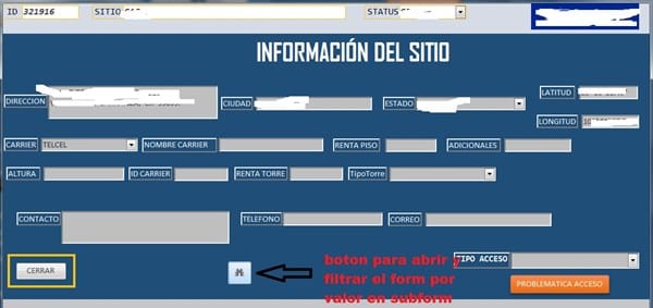 Private Sub Comando29_Click() Dim NombreForm As String NombreForm = "forContractual" If CurrentProject.AllForms(NombreForm).IsLoaded Then DoCmd.Close acForm, NombreForm 'Abro el formulario NombreForm, pasandole como parámetro el Id del registro seleccionado DoCmd.OpenForm FormName:=NombreForm, WindowMode:=acWindowNormal, WhereCondition:=" IdSitio = '" & Me.IdSitio & "'" End Sub