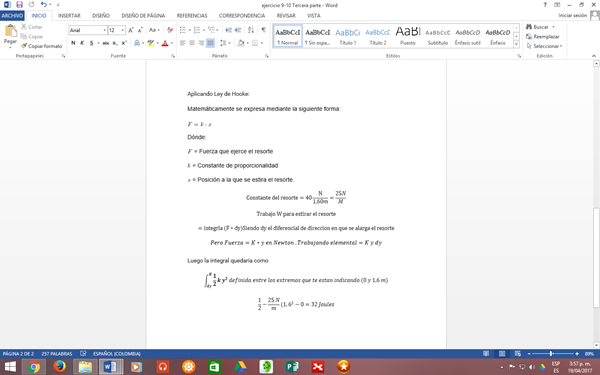 - Un resorte tiene una longitud de 1 metro, al aplicarle una fuerza de 40 Newton, dicho resorte se estira hasta 2,6 metros. Hallar el trabajo que se requiere para que el resorte se estire 3 metros.
