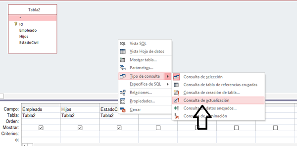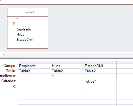 -Literalmente este ejercicio pone: "Cree una consulta de actualización reemplace el campo Hijos con 1 si en el campo Estado Civil pone “Otros”.