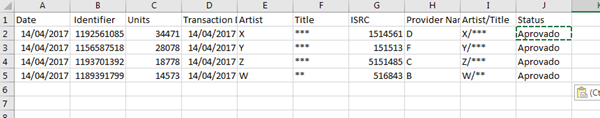 La (Hoja 2) esta compuesta por las siguientes columnas: Artist-Title-ISRC-Vendor Id-UPC-GRID-Identifier-Label-Provider Name-Release Date (Ocupando de la "A" a la "J" )