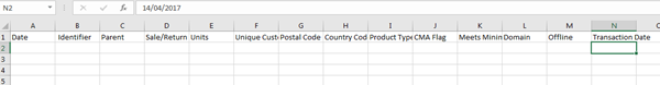 Después tengo que cruzar las bases en la primera esta compuesta por estas columnas(Hoja 1): Date- Identifier-Parent-Sale/Return-Units-Unique Customers-Postal Code-Country Code-Product Type-CMA Flag-Meets Minimum Price Flag-Domain-Offline-Transaction, Date (ocupando de la "A" a la "N") adjunto imágenes.