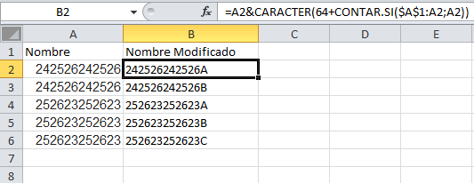 Deseo que según se repita el mismo número en una columna de lado, o en el mismo nombre ponga A, B, C… según veces se repita, EJEMPLO