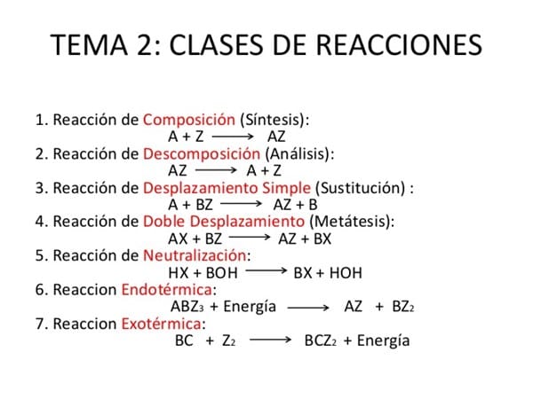 Cada estudiante escogerá una de las siguientes reacciones y las clasificará según su clase: