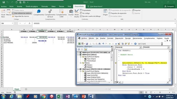 Sub PAGADO() ' ' PAGADO Macro ' ActiveCell.Offset(-6, 3).Range("A1").Select With Selection.Font .Color = -65536 .TintAndShade = 0 End With Selection.Font.Bold = True End Sub