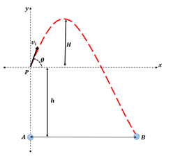 Una partícula de 0,456 kg de masa se dispara desde P como se muestra en la figura 2, con una velocidad inicial vi, que tiene una componente horizontal de 35,6 m/s. La partícula asciende hasta la altura máxima de 20,0 m sobre P. Con la ley de conservación de la energía determine a) la componente vertical de vi, b) el trabajo efectuado por la fuerza gravitacional sobre la partícula durante su movimiento de P a B, y c) las componentes horizontal y vertical del vector velocidad cuando la partícula llega a B.