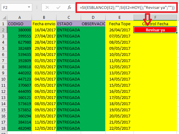 Tengo un excel en el cual en mi caso a partir de una fecha columna (B) calculo la fecha Tope columna (E) que uso para revisar dicho envío que es sumar 10 días a la fecha de envío pues bien cuando cumpla esa condición he utilizado la fórmula que se ve en la imagen para que me avise, aún podría esperar hasta un tope de 13 días para anular el envío si estuviera apunto de hacerse la entrega así que mi idea si pudiera ser sería añadir a esa fórmula lo siguiente:
