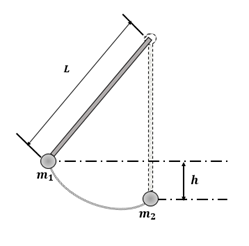 Dos pequeñas esferas, de masas respectivas m1 y m2 kg, cuelgan de un punto común mediante sendos hilos de longitud L m, como se indica en la figura 4. La esfera m2 se encuentra en reposo y la esfera m1 se abandona a partir de la posición que se indica, de modo que tenga lugar una colisión frontal y perfectamente elástica entre ambas esferas. Determinar la altura a la que ascenderá cada esfera después del primer choque.