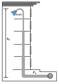 Agua con presión manométrica de P1 atm a nivel de la calle fluye hacia un edificio de oficinas con una rapidez de v1 m/s a través de una tubería de d1 cm de diámetro. La tubería se adelgaza a d2 cm de diámetro en el piso superior a h2 m de altura sobre el nivel de la calle (Ver figura 5), donde se ha dejado abierto el grifo del agua. Calcule a) la velocidad de flujo y b) la presión manométrica en tal tubería del piso superior. (Suponga que no hay tuberías de ramificación y que se la viscosidad del fluido es despreciable.
