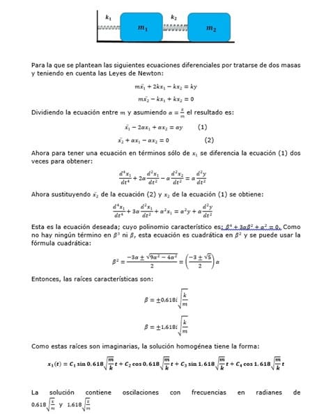 $$\begin{align}&x''_1+2\alpha x_1-\alpha x_2=\alpha y\quad(1)\\&x''_2-\alpha x_1+\alpha x_2=0\qquad (2)\\&\\&\text{La derivación dos veces de (1) la hacen bien}\\&\\&\frac{d^4x_1}{dt^4}+2\alpha \frac{d^2x_1}{dt^2}-\alpha \frac{d^2x_2}{dt^2}=\alpha \frac{d^2y}{dt^2}\\&\\&\text{Las sustitución primera que dice es } x''_2 \text{ de la ecuación (2)}\\&\\&\frac{d^2x_2}{dt^2}= x''_2=\alpha x_1-\alpha x_2\\&\\&\text{quedando}\\&\\&\frac{d^4x_1}{dt^4}+2\alpha \frac{d^2x_1}{dt^2}-\alpha(\alpha x_1-\alpha x_2)=\alpha \frac{d^2y}{dt^2}\\&\\&\text{y la segunda sustitución es }x_2 \text{ de la ecuación (1)}\\&\\&x_2=\frac{x_1''+2\alpha x_1-\alpha y}{\alpha}= \frac 1\alpha \frac{d^2x_1}{dt^2}+2x_1-y\\&\\&\text{haciéndola queda}\\&\\&\frac{d^4x_1}{dt^4}+2\alpha \frac{d^2x_1}{dt^2}-\alpha\left(\alpha x_1-\alpha\left( \frac 1\alpha \frac{d^2x_1}{dt^2}+2x_1-y\right)\right)=\alpha \frac{d^2y}{dt^2}\\&\\&\frac{d^4x_1}{dt^4}+2\alpha \frac{d^2x_1}{dt^2}-\alpha^2x_1+\alpha \frac{d^2x_1}{dt^2}+2\alpha^2x_1-\alpha^2y=\alpha \frac{d^2y}{dt^2}\\&\\&\frac{d^4x_1}{dt^4}+3\alpha \frac{d^2x_1}{dt^2}+\alpha^2x_1=\alpha^2y+\alpha \frac{d^2y}{dt^2}\\&\\&\text{que es la misma que han escrito, luego ese paso está bien}\\&\\&\text{Las soluciones de }\beta^2 \text{están bien y también las de }\beta\\&\\&\text{Y la solución de }x_1(t) \text{ está bien, acorde al caso de raíces complejas}\\&\end{align}$$A ver si ahora puedo mandarlo.