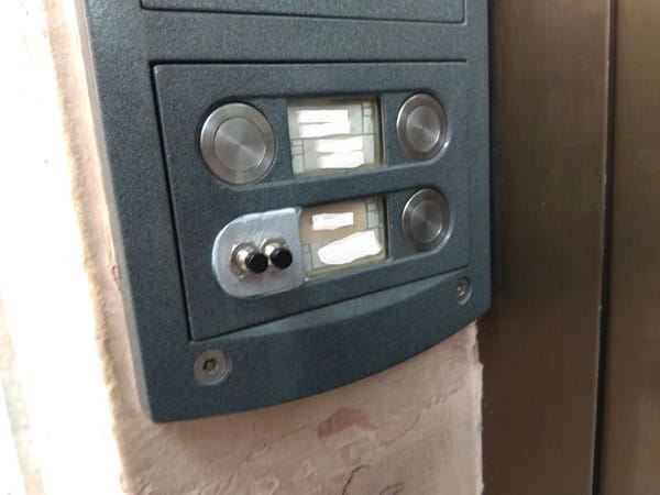 Tengo un piso viejó el cual reformé y convertí en dos pisos independientes. El problema es que en el portero automático no había más espacio, así que me hicieron esta chapucilla provisional para dar servicio a ambos pisos... Funcionar funciona, ¿pero a alguien se le ocurre una opción un poco más elegante / menos cutre (y que no sea cambiar la botonera entera)? Si encontrara algún tipo de botón semicircular, tal vez quedaría un poco mejor, pero no he encontrado nada.