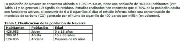 Problema. Calcule el porcentaje de monóxido de carbono (CO) de cada cigarrillo consumido en la población de Navarra; tenga en cuenta que la concentración del CO se da en volumen (cm3) por m3 de aire. Haga una relación con el número de habitantes considerados como fumadores activos.