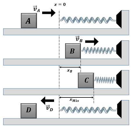 D. La figura usa un eje “x” horizontal, positivo hacia la derecha, que corre a lo largo del eje del resorte. El origen X=0 está ubicado en el punto del extremo izquierdo del resorte no deformado, como lo muestra la primera subfigura. Para la coordenada “X” del bloque, use su cara frontal (la del lado del resorte). El contacto entre bloque y resorte comienza entonces en la coordenada X=0 . Si la coordenada “X” del bloque en las posiciones A y D es xA, D m, trace una gráfica cuantitativa (ejes marcados numéricamente) de la rapidez del bloque contra su posición (v en el eje Y, x en el eje X). La gráfica debe cubrir todo el movimiento del bloque desde A hasta D, utilice un software especializado para la gráfica