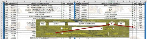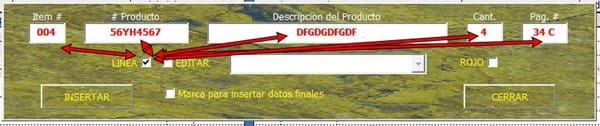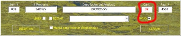 wcolor = vbBlack: wbold = False If CheckBox3 Then wcolor = 3: wbold = True Cells(fil, col) = TextBox1 'Item # Cells(fil, col + 1) = TextBox2 'Producto # Cells(fil, col + 2) = TextBox3 'Descripcion del Producto Cells(fil, col + 8) = TextBox4 'Cant. Cells(fil, col + 8).Font.ColorIndex = wcolor Cells(fil, col + 8).Font.Bold = wbold Cells(fil, col + 9) = TextBox5 'Pagina #