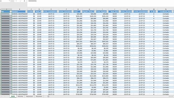 Tengo el archivo que tiene 4 hojas de calculo, en la hoja llamada BASE es donde esta toda la informacion de clientes con se ve en la imagen llamada base
