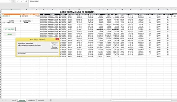 EN LA HOJA LLAMADA INFORME: es donde hay una macro con un filtro que lo que hace es llamar a un cliente y trae la informacion según el rango de fechas, como se ve en la imagen llamada informe