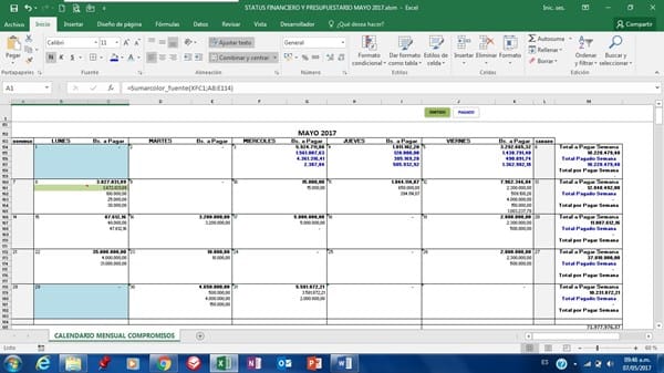 En la columna M tengo con color azul, la sumatoria de lo que he pagado. Por ejemplo, en la primera semana de mayo (que abarca desde el día 01 al día 07) lo que he pagado está reflejado justo debajo de la Celda que dice “Total Pagado Semana”, es decir la celda M157. La cifra que está en M157 se está calculando con una macro (que suma valores dependiendo del color de la fuente “=Sumarcolor_fuente(M156;B155:K159)” (en este caso color azul).