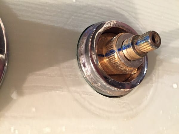 Este tornillo de la imagen va a través del circulo metálico donde va introducido el cartucho y a su vez del propio cartucho, en la foto se ve el agujero donde se introduce para quedar el mismo fijado a la columna. (Yo lo dañe mucho como se ve en la foto porque no lo vi y lo intente sacar a lo bruto.)