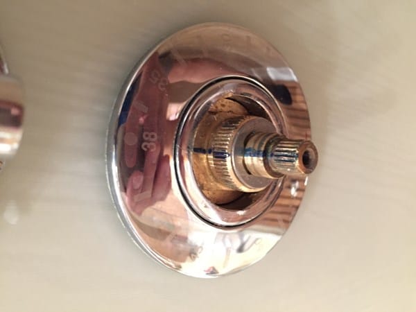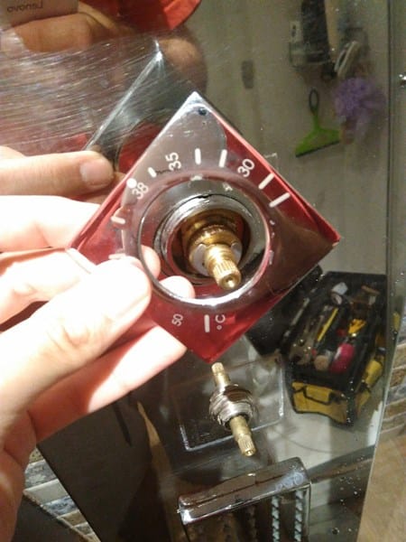 El mando de abajo lleva una arandela que sale girando en sentido opuesto a las agujas del reloj. (El mando que tiene el punto rojo y azul). Debes tener en cuenta que la arandela del frontal donde esta el mando donde se ven grabados los grados de temperatura también esta roscada y debes hacer lo mismo para desenroscarla y poder sacar el grupo del a propia columna.