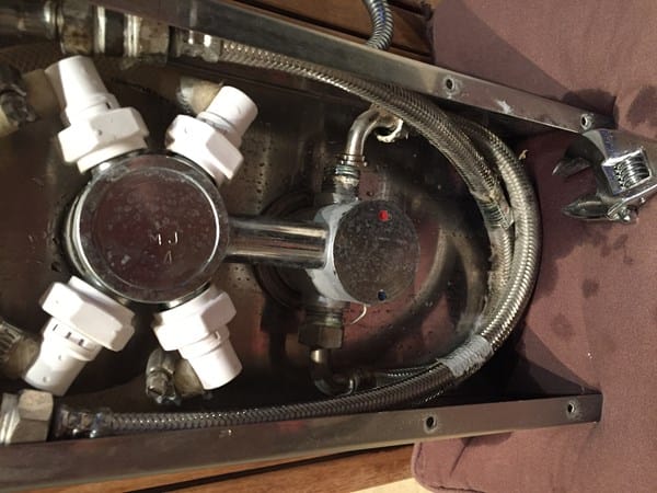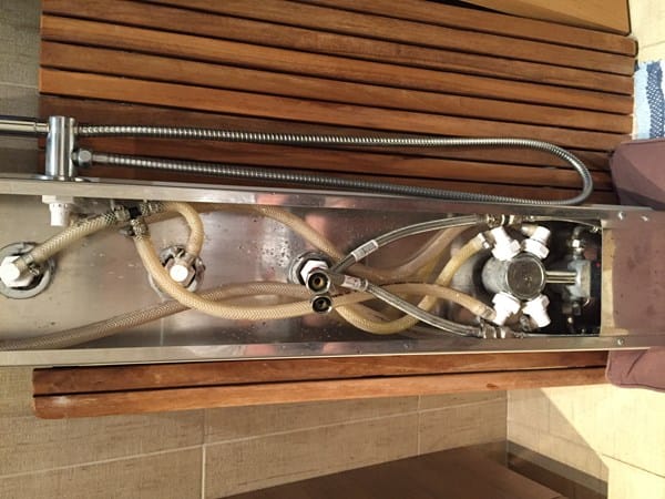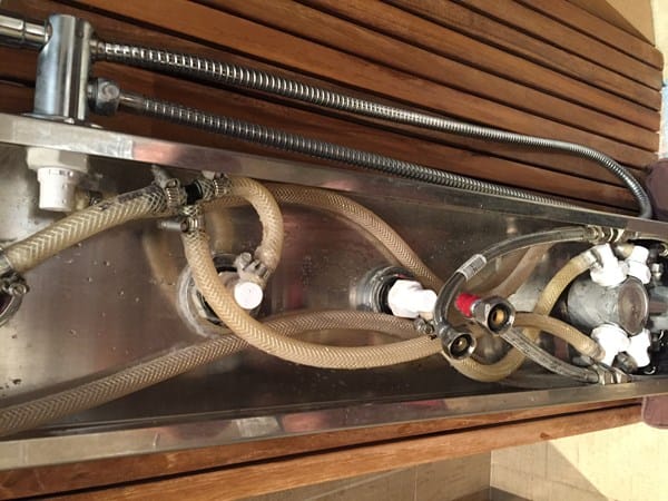 Afloja los racores que van a los distintos chorros como en la imagen y si puedes rodea el tubo del agua caliente con cinta para recordar cual es cual.