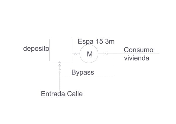 Tengo una vivienda en un diseminado, a la cual le llega agua del pueblo, pero a un presión insuficiente, sobretodo en verano. Tiene un deposito en altura, con un bypass instalado, por lo cual solo se usa cuando no hay presión de la calle. Quería pone un grupo de presión para dar presión suficiente a la casa y estar constantemente renovando el agua del deposito. He hecho este es que, a, pero no se si es correcto. Agradecería que me dietan las indicaciones necesarias para lo que quiero conseguir. Gracias!