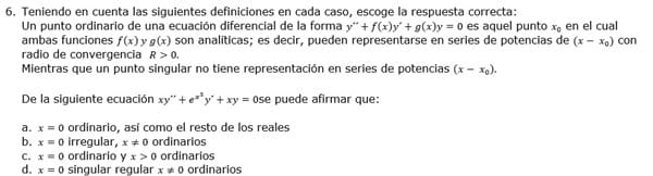 Por lo tanto la respuesta es la d), x=0 es un punto singular regular y los demás son ordinarios.