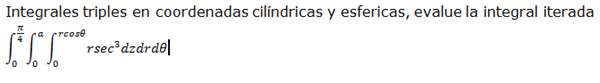 $$\begin{align}&\int_0^{ \frac{\pi} 4}\ \int_0^{a}\ \Bigg[\int_{z=0}^{z=r \cos \theta}rsec^3 \theta \ dz \Bigg]drd \theta=\\&\\&\int_0^{ \frac{\pi} 4}\ \int_0^{a}\ \Bigg[z \Bigg]_0^{r \cos \theta} rsec^3 \theta drd \theta=\\&\\&\\&\int_0^{ \frac{\pi} 4}\ \int_0^{a}\ rcos \theta · rsec^3 \theta \ dr\ d \theta=\\&\\&\\&\int_0^{ \frac{\pi} 4}\ \Bigg[ \int_{r=0}^{r=a}\ r^2sec^2 \theta\ dr \Bigg]\ d \theta=\\&\\&\int_0^{ \frac {\pi} 4} sec^2 \theta \Bigg[ \frac{r^3} 3 \Bigg]_0^{a}\ \ d \theta=\\&\\&\frac{a^3} 3 \int_0^{ \frac {\pi} 4} sec^2 \theta d \theta=\\&\\&\frac{a ^3} 3 \Bigg[tan \theta \Bigg ]_0^{ \frac{\pi} 4}=\\&\\&\frac{a ^3} 3 (1-0)=\\&\\&\frac{a ^3} 3 \\&\\&\\&\end{align}$$