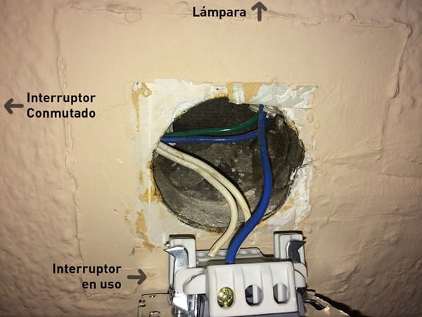 ¿Cómo tendría que empalmar los cables para anular la conmutación? Doy por supuesto que el tubo corrugado que viene de arriba es la fase (cable azul) y el neutro (cable verde), ya que otro cable azul es el que da fuerza al interruptor en uso, y que el tubo que sale hacia la izquierda va al otro interruptor conmutado (cables blancos).
