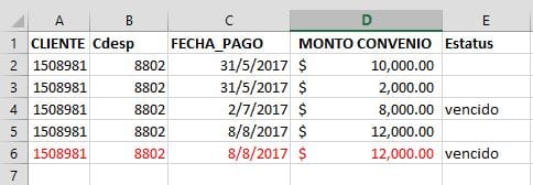 Lo que me gustaría es que identificará los valores repetidos (rojo) y los elimine, además de seleccionar las filas con la leyenda "vencido" copiándolas y pegándolas en otra hoja "hoja 7"