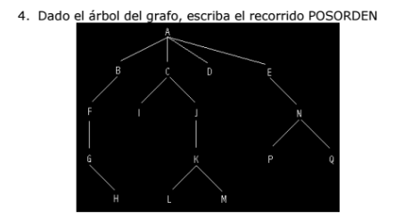 Matemáticas armndo Rodriguez el 13 may. 17 Solucionar dado el árbol del grafo, escriba el recorrido POSORDEN... Dado el árbol del grafo, escriba el recorrido POSORDEN Seguir Siguiendo Dejar de seguir