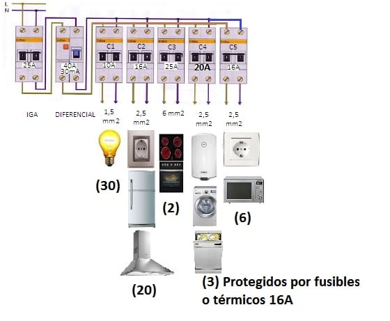 Me han hecho la instalación eléctrica en la reforma de mi piso del año 1963. El electricista solo me ha puesto 4 circuitos, y los enchufes de la cocina me los ha conectado al diferencial de la Lavadora, lavavajillas y termo. Yo creo que la ley marca que los auxiliares de la cocina (también microondas) y los enchufes del baño, han de ir en el circuito C5 con su propio diferencial, por tratarse de zonas húmedas.