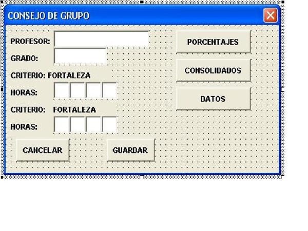 Tengo un userform con unos textbox para un ingreso de datos como esta en la imagen pero el botón guardar es el mas difícil de configurar pues necesito que en el campo del el textbox profesor yo digite el nombre de algún profesor y me lo busque luego que lo que digite en el grado el vaya y me busque el grado donde esta el profesor luego en las fortalezas por hora el vaya y me ponga las x (estas van en los cuadros pequeño) en su respectiva fortaleza