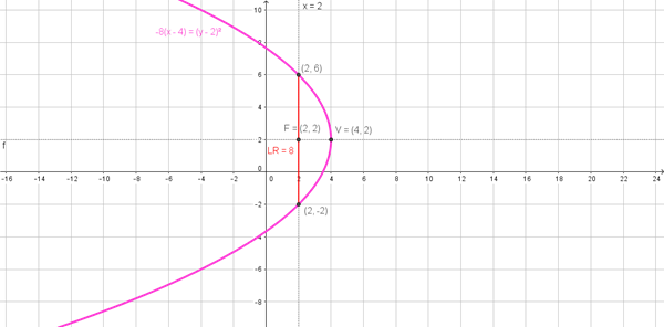 Obtener la ecuación en forma canónica de las siguientes parábolas. Además, determinar las coordenadas del vértice, del foco, de los extremos del lado recto y la longitud del lado recto. Dibuje la gráfica de cada parábola.