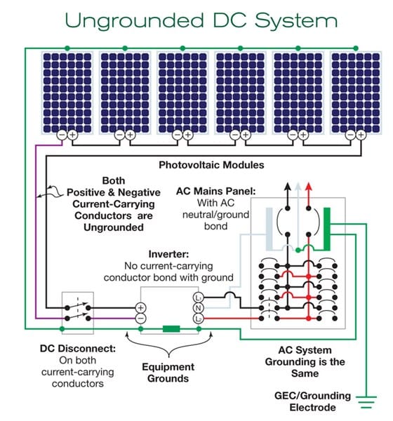 En mi país el sistema eléctrico domiciliario es monofásico y no hay sistemas fotovoltaicos conectados a la red (todos son off-grid). Revisando en internet veo que se usa mucho los sistemas totovoltaicos flotantes (sin conexión a tierra) en el lado DC, y los dos conductores (+ y -) se conectan directamente al inversor. Este a su salida tiene cuatro cables: dos fases (L1 y L2), un neutro (N) y la puesta a tierra (GND).