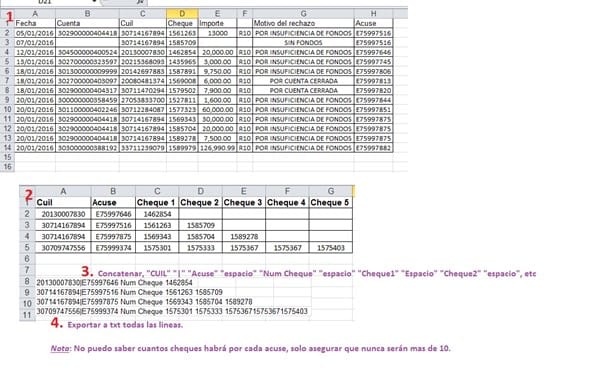 Por cada acuse habrá más de un cheque, necesitamos que queden los datos en las columnas siguientes para luego realizar un alta masiva.