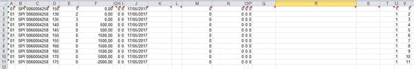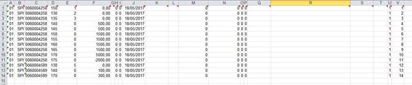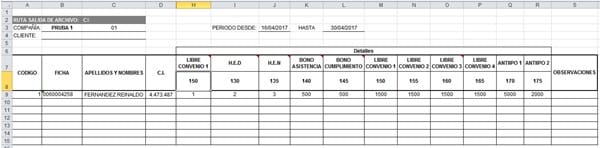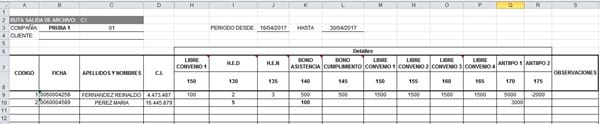 Con las siguientes características en la columna A es el código de la compañía que es 01 (puede cambiar), en la columna B es un código por defecto, en la columna C es la ficha de la persona en la columna D es el código de cada descripción de los detalles Ejemplo Libre Convenio 1 el código es el 150, el de H.E.D es el 130 como se puede apreciar en la 1ra imagen, en la columna E si el detalle es por cantidad y en la columna F si el detalle es por monto, la columna G es en blanco, las columnas H y I es valor 0, la columna es la fecha el cual se esta realizando el reporte, las columnas K y L en blanco; las columnas M; N; O; P valor 0, las columnas Q; R; S; y T en blanco; la columna U valor 1 por defecto; y la columna V es un consecutivo.
