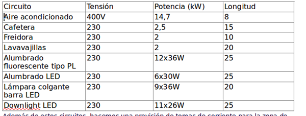 Además de estos circuitos, hacemos una previsión de tomas de corriente para la zona de barra, para la cocina y aseos, y para la zona de público.