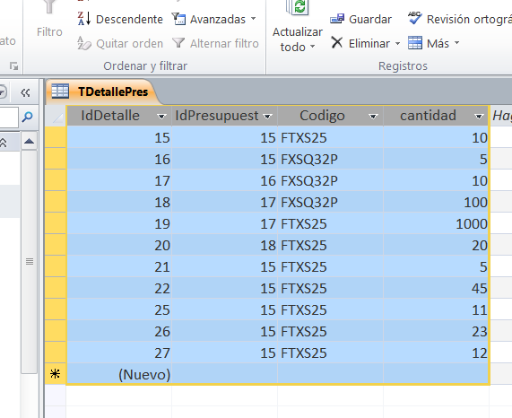 Estoy empezando a diseñar una base de datos en access, y tengo un formulario en blanco con un boton guardar para que me inserte en una tabla los valores de unos registros que están en un cuadro de texto del formulario.